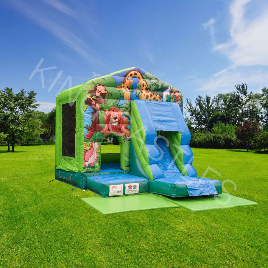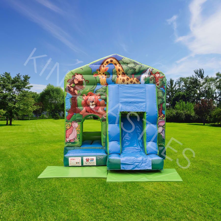 The Jungle Bouncy Castle & Slide is the perfect solution for parties with more limited space. At 13ft(L) X 9ft(W) it is the best bouncy castle and slide combination for gardens with limited space and no outdoor access via gates.Compact doesn’t mean without impact, as this bouncy castle and slide combination really stands out. Perfect for the little adventurers in your life, this colourful castle makes you feel like you are stepping into a jungle. Perfect for a jungle themed party, this unit is also suitable for any boy or girl’s party, communion, confirmation or get together.