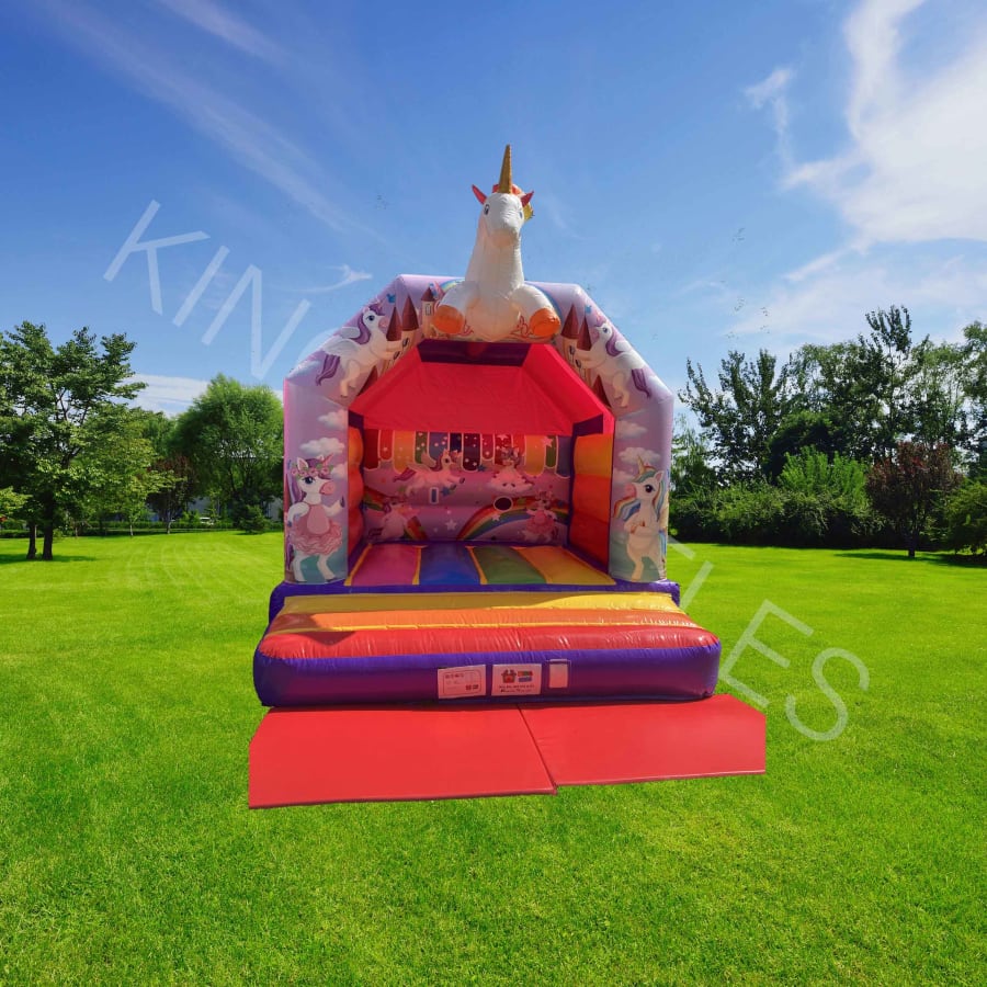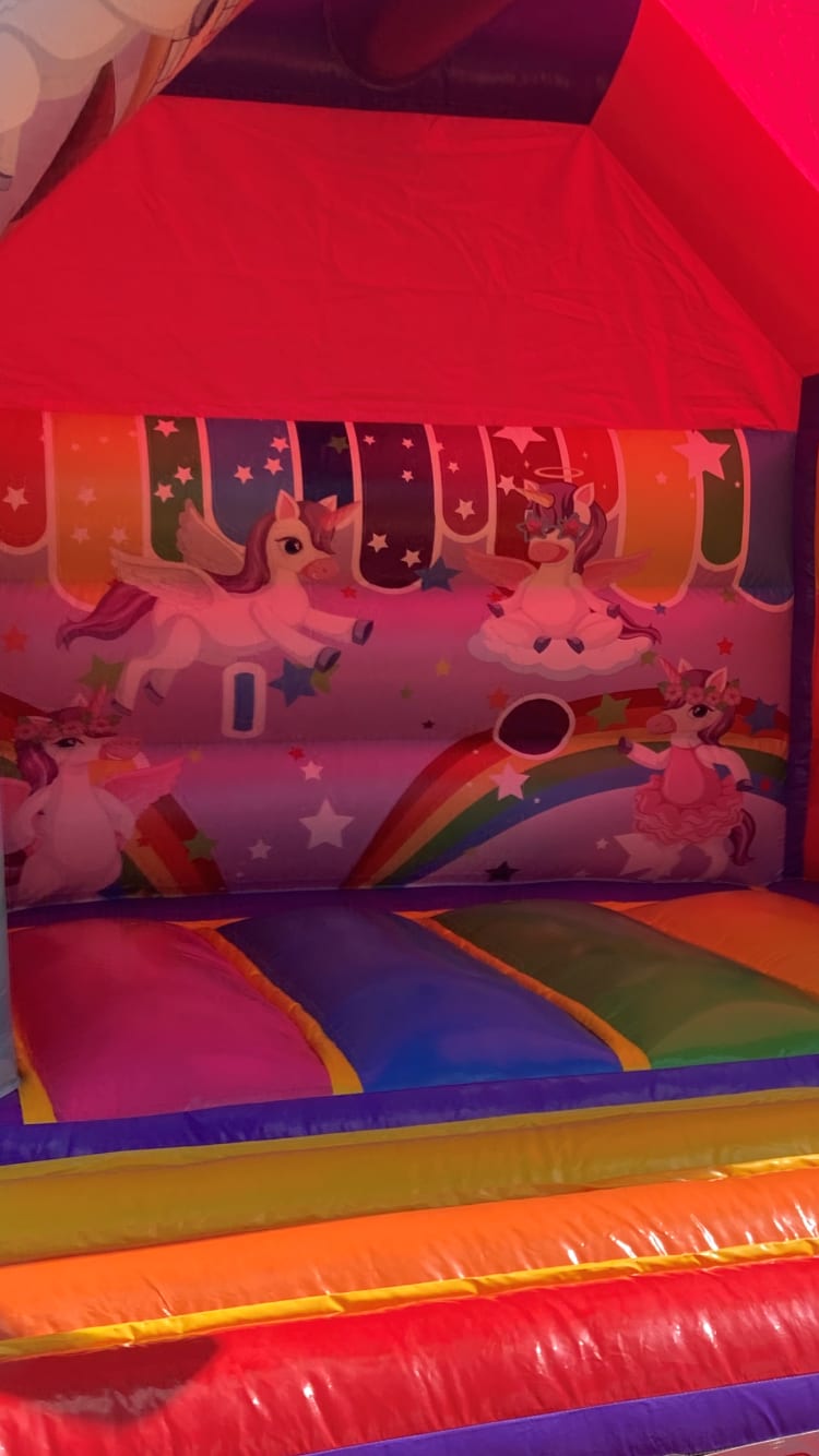 Make any little child’s dreams come true for their birthday party with this adorable Unicorn bouncy castle. The Unicorn Bouncy Castle is 12ft(L) X 12ft (W), and features a large unicorn bursting from above the top of the bouncy castle. Can you imagine the delight when this is discovered in your garden? Pink and covered in clouds and rainbow patterns, this is the perfect bouncy castle for your child’s birthday party, communion or general get together. This bouncy castle is ideal for smaller kids and smaller parties as it has a minimized bouncing space, please get in touch if you are in doubt over the number/age of users.