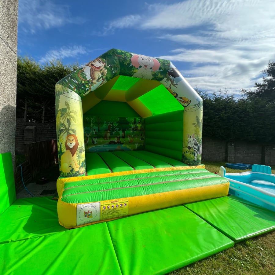 Turn your garden into a wild jungle adventure with our Jungle Bouncy Castle! This brightly coloured inflatable castle features a vibrant digital print of jungle animals, creating a captivating and exciting atmosphere for kids of all ages.