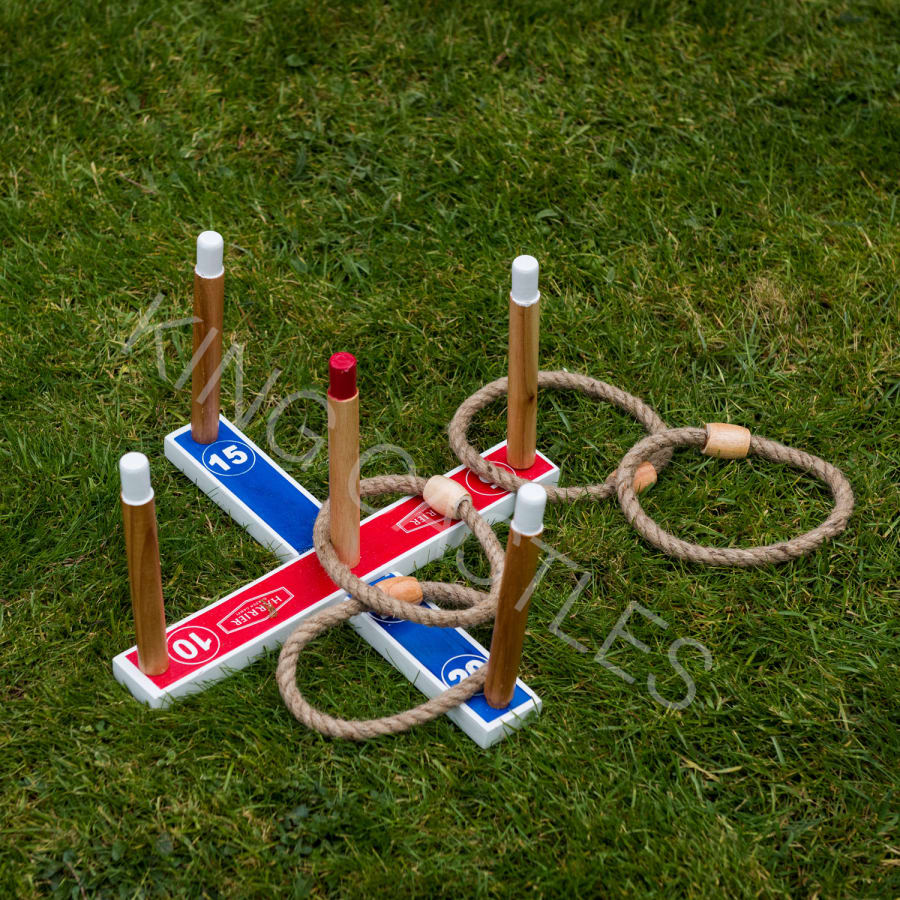 Quoits is a traditional ring toss game. Five stakes, each with different scores and increased difficulty are your targets. Take turns tossing the rings, count up the scores and the best score wins.